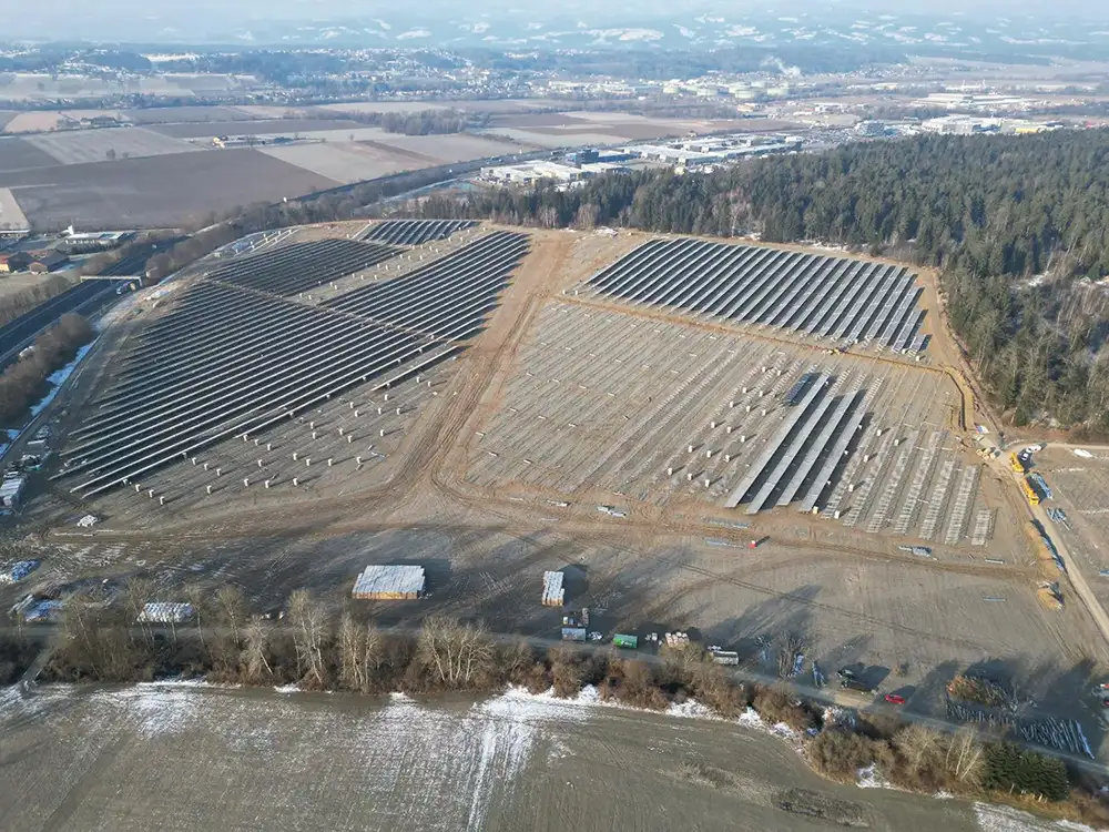 Mit fast 21 MW ist die PV-Anlage im österreichischen Dobl-Zwaring, direkt an der A2, das bisher größte Projekt, für das wir unser FA DUO Bifazial System konzipieren, fertigen und liefern durften. Das ausgeklügelte System minimiert die Verschattung der Modulrückseite und kommt ohne Modulklemmen aus. Dies verkürzt die Montagezeit um 25% und senkt die Gestehungskosten. Der Solarpark ist der größte der Steiermark und wird mehr als 6.000 Haushalte aus Dobl und Umgebung versorgen.
